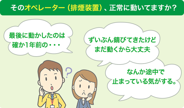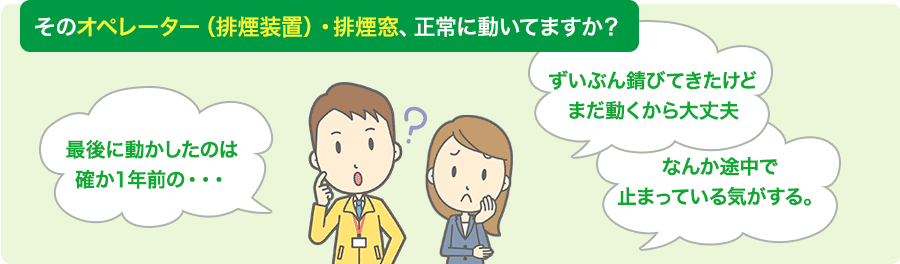 オペレーター(排煙装置)・排煙窓を設置されている場合は信頼ある施工業者への定期的な点検整備をお勧めいたします。